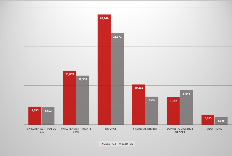 Figures released by the Ministry of Justice have highlighted the effect of Covid-19 on the family courts, with the total number of cases between April and June falling by 13% compared to the same period last year.